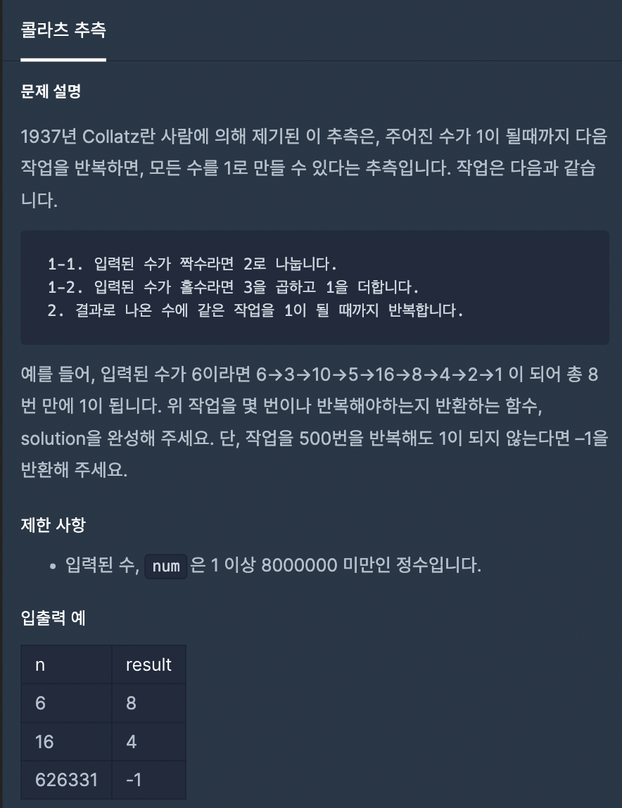 [프로그래머스] 콜라츠 추측 -JS 본문