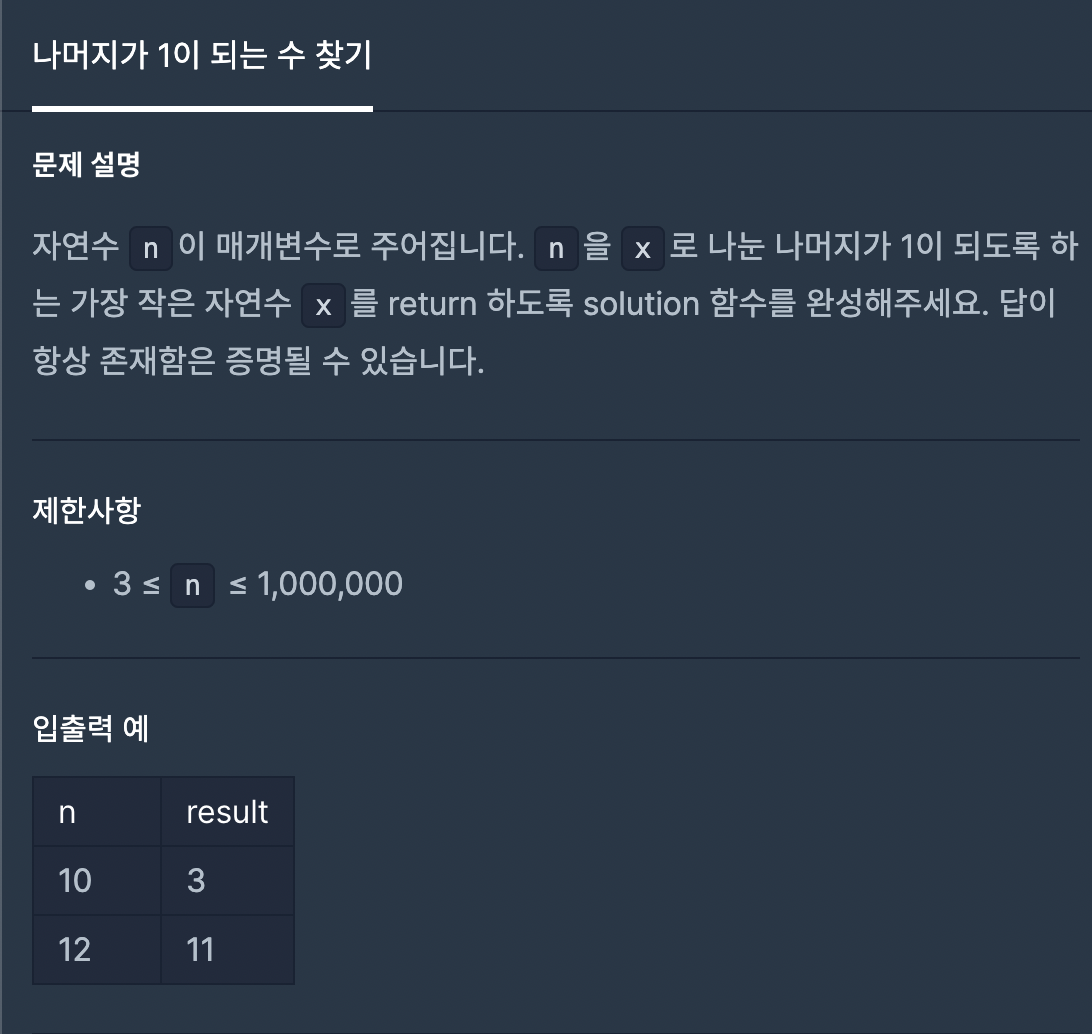 [프로그래머스] 나머지가 1이 되는 수 찾기 -JS 본문
