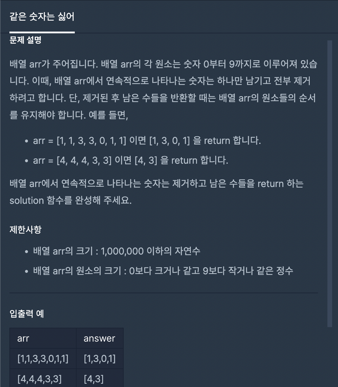 1. filter의 index인자를 활용하여 arr요소 중 그 다음요소와 같지 않은 것을 골라냄