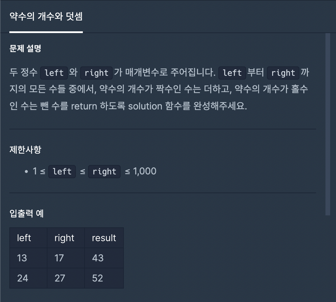 [프로그래머스] 약수의 개수와 덧셈 -JS 본문