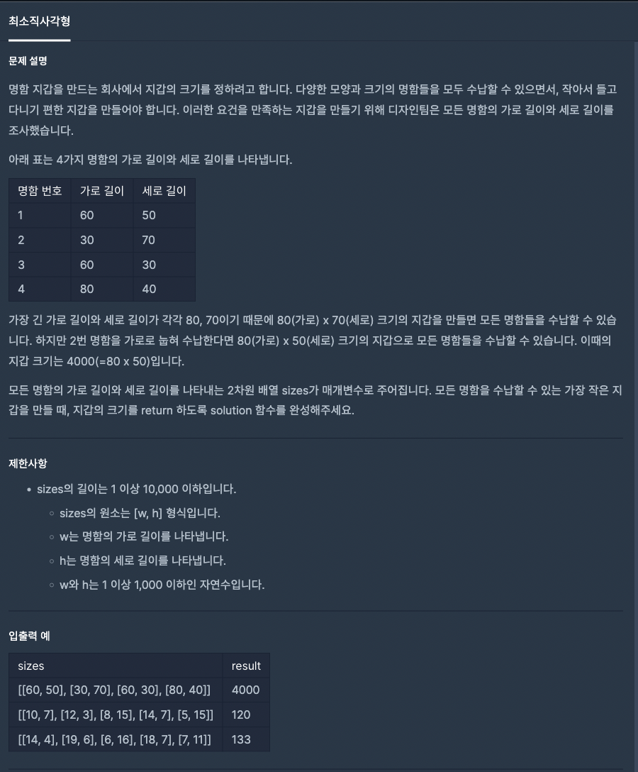 1. 배열을 맵핑하여 w,h를 비교, 각자 큰 쪽으로 큰 수 몰아주기