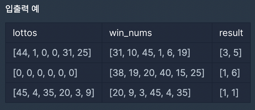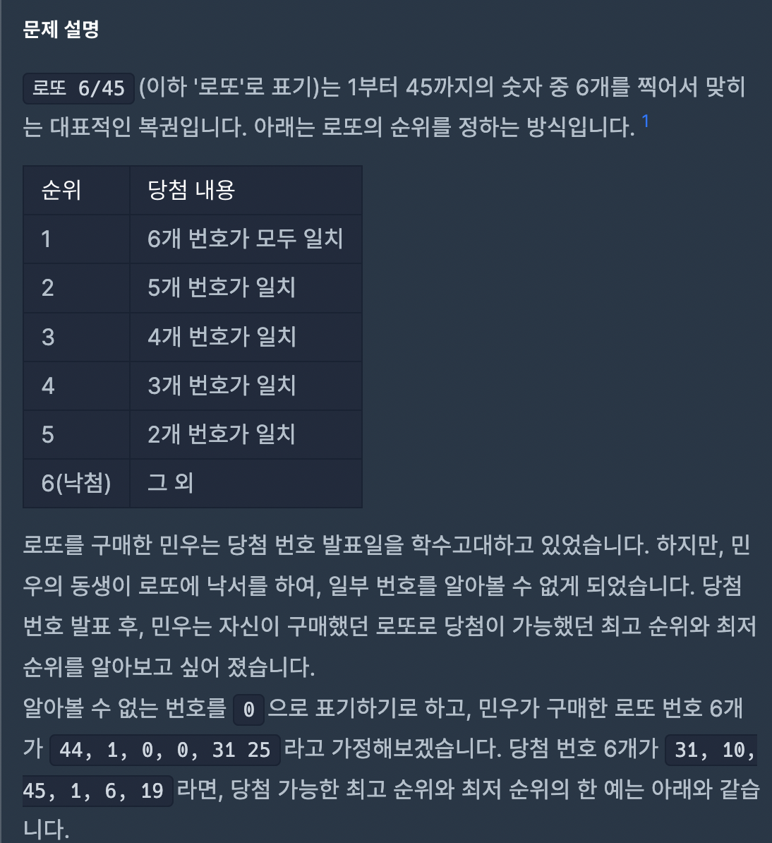 6. win배열의 길이가 0일 경우에는 (경우의수: 모두 0인경우 => [1,6], 0이 하나인경우 =>[6,6], 0이 없는경우 => [6,6])