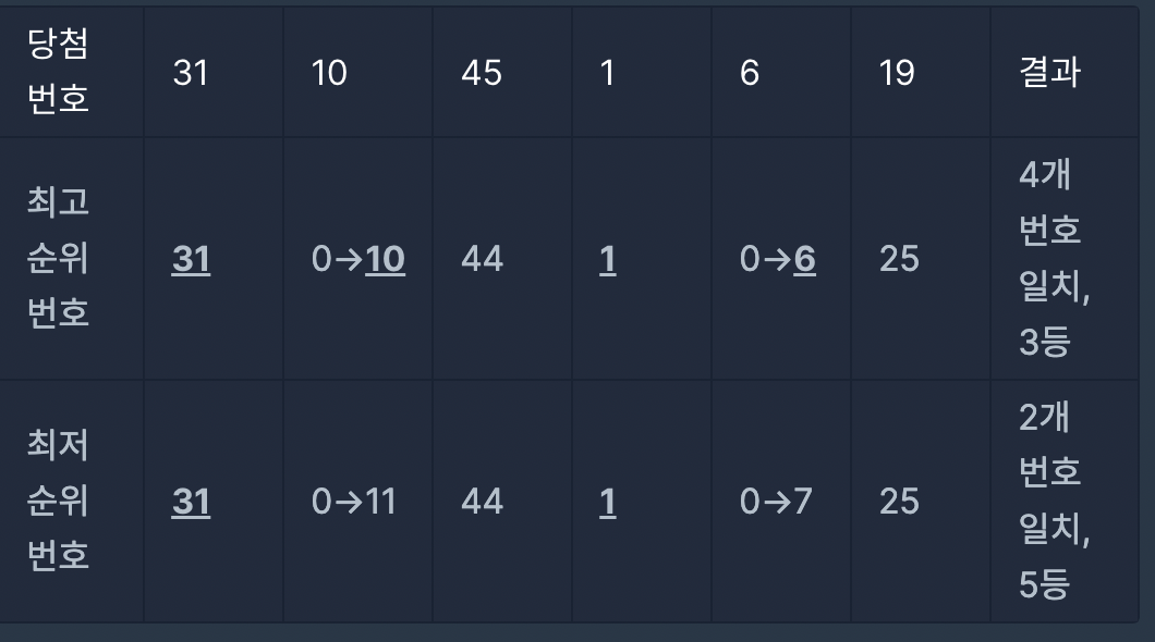 7. 그리고 win의 길이가 6도 0도 아닌경우에는 [ranking[maxWins],ranking[win.length]] 배정해준다. ( 0모두당첨 // 0모두비당첨)