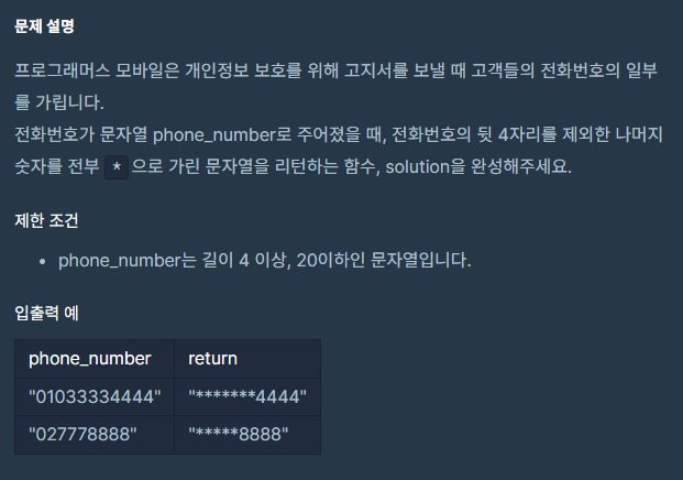 [프로그래머스] 핸드폰 번호 가리기 -JS 본문
